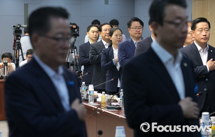 (서울=포커스뉴스) 2일 오전 서울 여의도 국회 의원회관에서 열린 국민의당 의원총회에 참석한 박지원 비상대책위원장, 김성식 정책위의장, 박준영 의원 등 의원들이 국기에 대한 경례를 하고 있다. 검찰은 수억 원대 공천헌금을 수수한 혐의로 박준영 의원에 대해 구속영장을 재청구했지만 기각됐다.