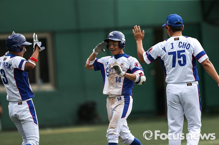 (서울=포커스뉴스) 1일 오후 서울 양천구 목동종합운동장에서 열린 2016 세계 청소년 야구 대회 대한민국과 일본 A조 경기 2회말 2사 1루 상황, 대한민국 변중섭이 홈런을 치고 홈 베이스로 들어오며 세레모니를 하고 있다.