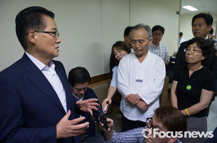 박 위원장은 '물대포를 발포한 책임자가 누군지 밝혀달라'는 요청에 "교섭단체 대표 간에 합의가 돼야 하니 우리가 최선을 다해, 여론을 등에 업고 관철하도록 하겠다"고 답변했다.박지원(왼쪽) 국민의당 비상대책위원장과 의원들이 2일 종로구 서울대학교병원을 찾아 지난해 민중총궐기 당시 경찰의 물대포를 맞고 입원 중인 백남기 농민을 위로 방문한 뒤 정현찬(가운데) 백남기대책위 공동대표 등 관계자들과 대화하고 있다. 2016.08.02 박동욱 기자