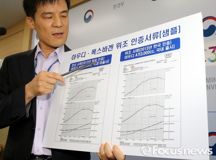 (세종=포커스뉴스) 홍동곤 환경부 교통환경과장이 2일 오전 세종시 정부세종청사 환경부 기자실에서 위조서류로 불법인증을 받은 폭스바겐 32개 차종(80개 모델)에 대해 인증취소 처분을 내렸다고 밝히고 있다.