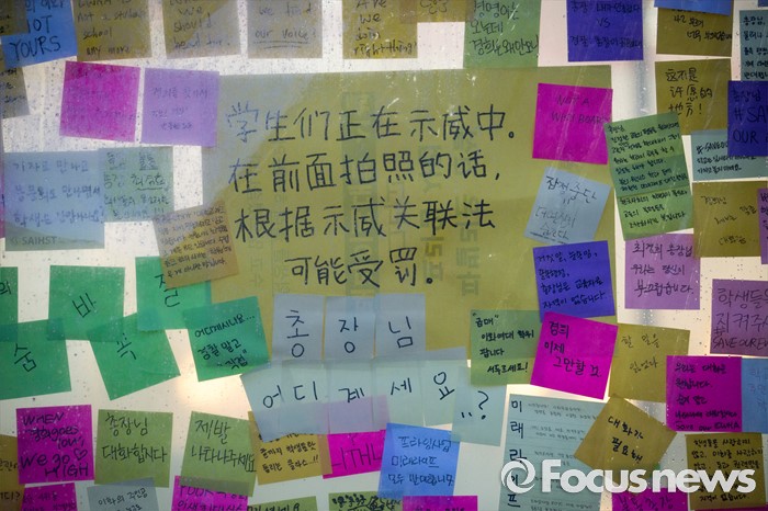 (서울=포커스뉴스) 미래라이프 대학 설립에 반대하는 학생들이 엿새째 이화여대 본관을 점거하고 있는 2일 밤, 서울 서대문구 이화여대 교내에 다양한 목소리의 시위성 글들이 붙어 있다.