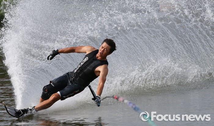 (공주=포커스뉴스) 3일 오후 충남 공주시 금강변에서 수상스포츠전문가들이 스상스키를 타며 물살을 가르고 있다.