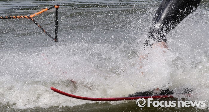 (공주=포커스뉴스) 3일 오후 충남 공주시 금강변에서 수상스포츠 동호인들이 스상스키를 타며 물살을 가르고 있다.