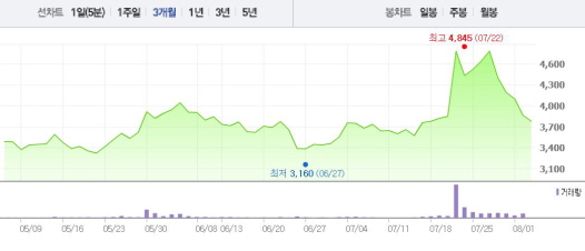 초록뱀은 7월25일에서 27일까지 2~3%의 상승폭을 기록했지만 7월28일부터 이달 2일까지 2~8%의 낙폭을 나타냈다.