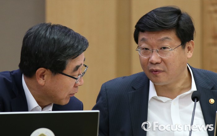(세종=포커스뉴스) 2일 오전 세종시 정부세종청사 국무회의장에서 열린 청와대-세종 영상 국무회의에서 주형환(오른쪽) 산업통상자원부장관이 이기권 고용노동부장관과 대화하고 있다.