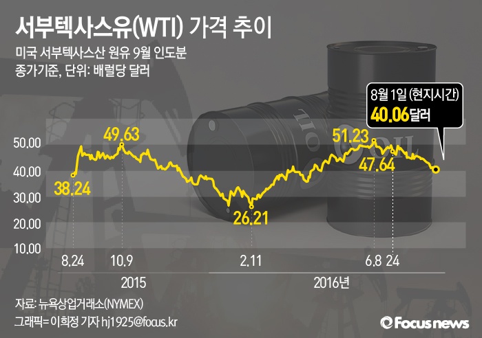 (서울=포커스뉴스) 1일(현지시각) 뉴욕상업거래소에서 9월분 인도분 서부텍사스유(WTI) 가격은 전일대비 3.7% 급락한 40.06로 마감했다. 이는 올 4월 이후 최저치다.