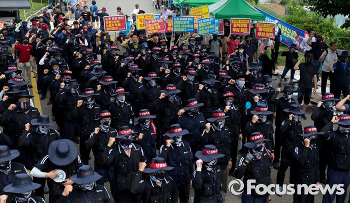 (아산=포커스뉴스) 1일 오후 충남 아산 탕정면 갑을오토텍에서 노조원들과 사측 경비 용역들이 대치하고 있다.