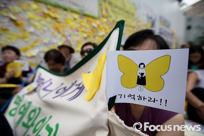 (서울=포커스뉴스) 3일 오후 서울 종로구 구 일본대사관 앞에서 열린 '제1242차 일본군 위안부 문제해결을 위한 정기 수요집회'에 참석한 시민들이 문제해결을 촉구하며 손 피켓을 들고 있다.