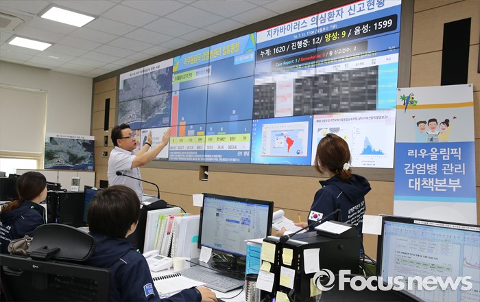 (청주=포커스뉴스) 2016 브라질 리우올림픽을 앞둔 1일 오후 충북 청주 흥덕구 오송 질병관리본부에 설치된 리우올림픽 감염병 대응 긴급상황실에서 관계자들이 지카바이러스 감염병 발생 동향 등을 살피고 있다.