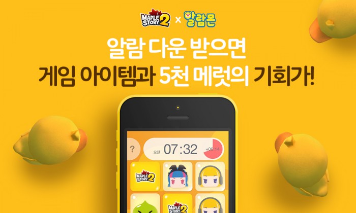 넥슨은 이번 제휴를 기념해 오는 9월 30일까지 알람몬 애플리케이션에서 메이플스토리2의 알람을 다운로드 하는 모든 유저에게 물약, 경험치 상승 아이템 등으로 구성된 성장 지원 패키지를 선물한다. 3회 이상 메이플스토리2 알람을 사용한 유저에게는 추첨을 통해 5천 메럿을 지급한다.