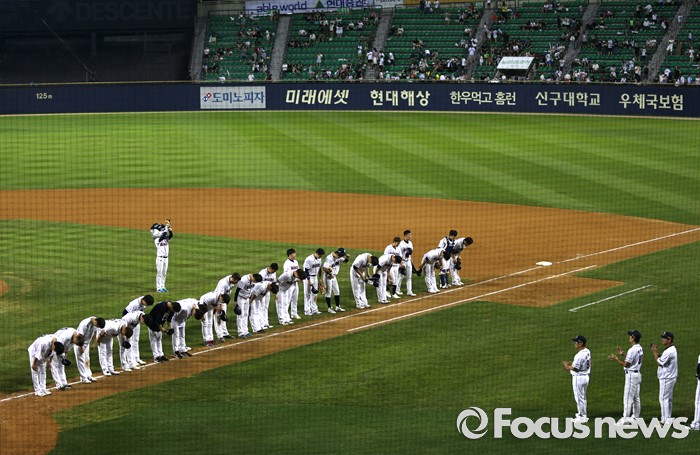 (서울=포커스뉴스) 2일 오후 서울 잠실구장에서 열린 2016 프로야구 LG-두산 경기에서 11점차로 승리한 두산 선수들이 승리를 자축한 뒤 관중들을 향해 인사를 하고 있다.