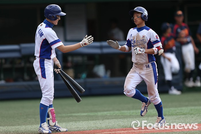 (서울=포커스뉴스) 1일 오후 서울 양천구 목동종합운동장에서 열린 2016 세계 청소년 야구 대회 대한민국과 일본 A조 경기 2회말 2사 1루 상황, 대한민국 변중섭이 홈런을 치고 홈 베이스로 들어오고 있다.