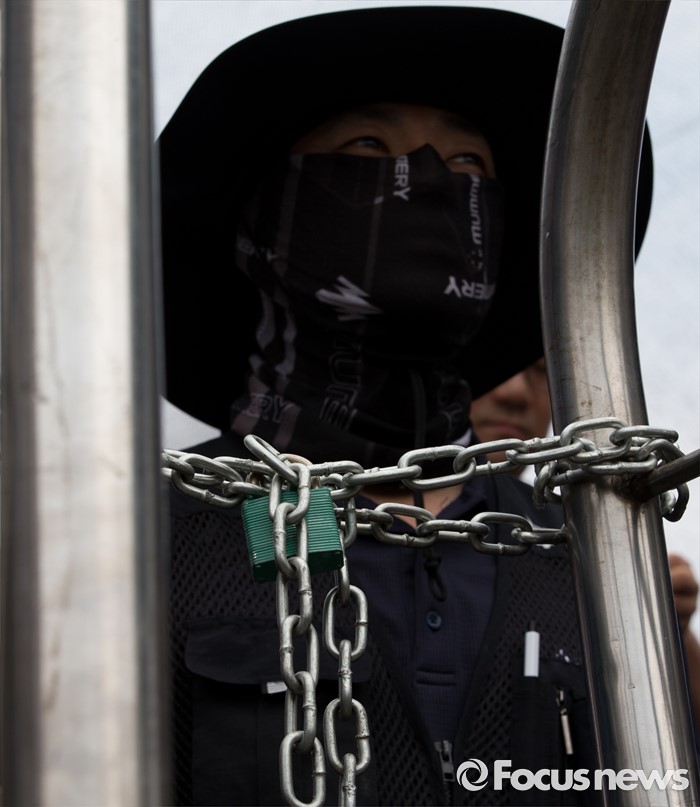 (아산=포커스뉴스) 1일 오후 충남 아산 탕정면 갑을오토텍에서 노조원들과 사측 경비 용역들이 대치하고 있다.