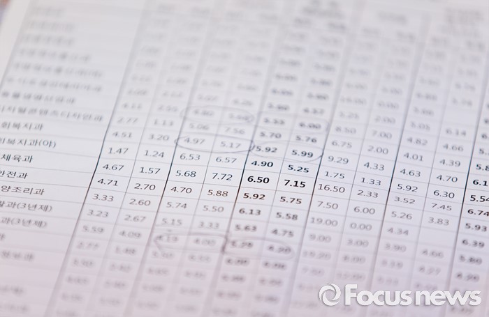 (서울=포커스뉴스) 3일 오후 서울 강남구 코엑스에서 열린 2017학년도 수시 전문대학 입학정보 박람회에서 한 대학교의 경쟁률 표가 진열돼 있다.