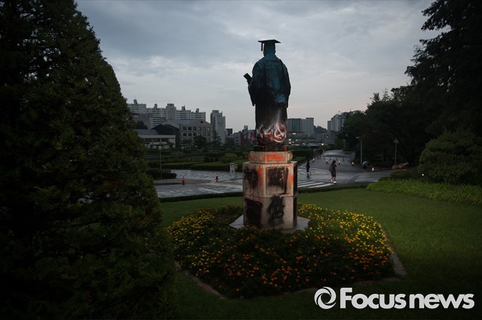 (서울=포커스뉴스) 2일 저녁 서울 서대문구 이화여대 교내에 락카 페인트와 계란 투척으로 얼룩져 있는 김활란 초대 총장 동상의 뒷모습이 보이고 있다. 이화여자대학교는 미래라이프 대학(평생교육 단과대학 지원사업)' 설립을 두고 학내 분규가 이어지고 있으며 단과대학 지원사업을 반대하는 학생들이 지난 28일부터 6일째 이대 본관을 점거해 농성하고 있다.