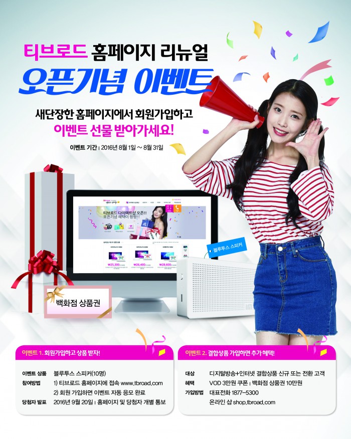 티브로드는 8월 한달 동안 홈페이지 개편 오픈을 기념해 온라인 다이렉트 샵을 통해 신규 디지털 방송 또는 디지털 방송과 인터넷 결합상품을 가입하는 고객들을 대상으로 VOD 3만원 쿠폰과 10만원 상품권을 지급한다. 또 해당 기간에 홈페이지를 가입하는 고객을 대상으로 추첨을 통해 샤오미 블루투스 스피커(10명)를 제공한다.티브로드가 홈페이지를 고객맞춤형으로 개편하고 이를 기념한 이벤트를 연다.<사진제공=티브로드>