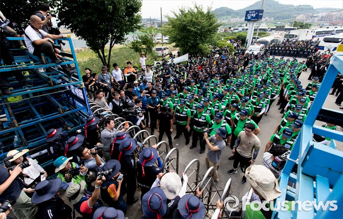 (아산=포커스뉴스) 1일 오후 충남 아산 탕정면 갑을오토텍에서 노조원들과 사측 경비 용역들이 대치하고 있다.