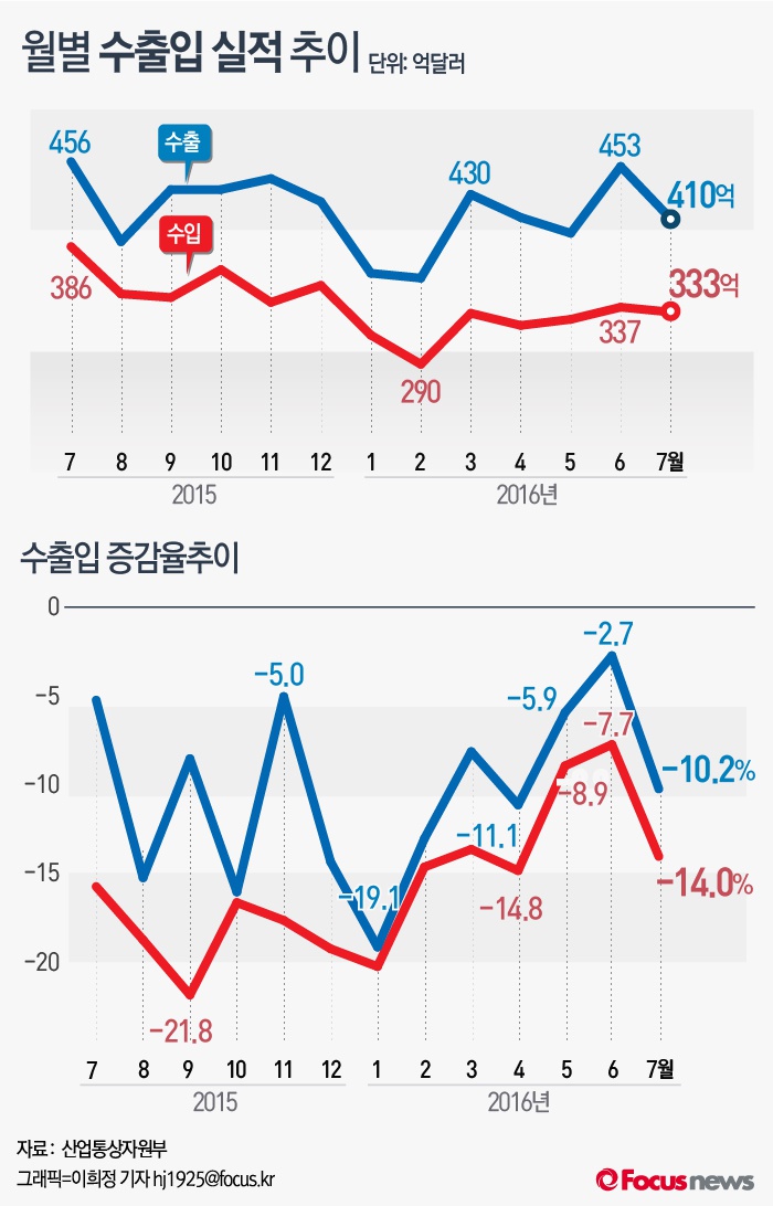 (서울=포커스뉴스) 1일 산업통상자원부에 따르면 7월 수출액은 410억달러,수입액은 333억달러를 기록했다고 밝혔다. 수출입 실적은 지난증감률은 지난 5월 이후 개선되 왔으나, 7월에 들어서 다시 두자릿수 하락세를 보였다.