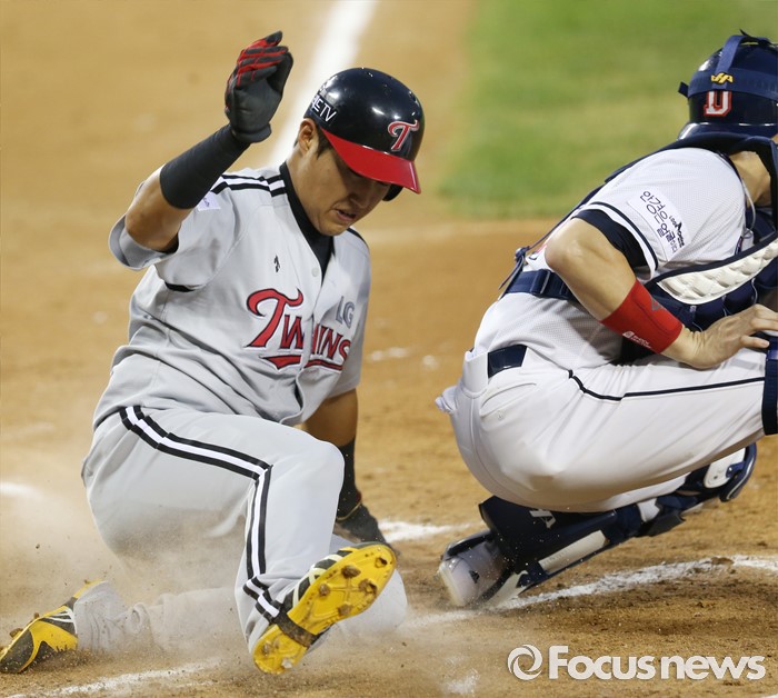 (서울=포커스뉴스) 3일 서울 잠실구장에서 열린 2016 프로야구 LG-두산 경기 4회초 무사 1루에서 LG 오지환의 우익선상으로 빠지는 3루타때 1루주자 채은성이 홈까지 뛰어 슬라이딩하며 세이프되고 있다.