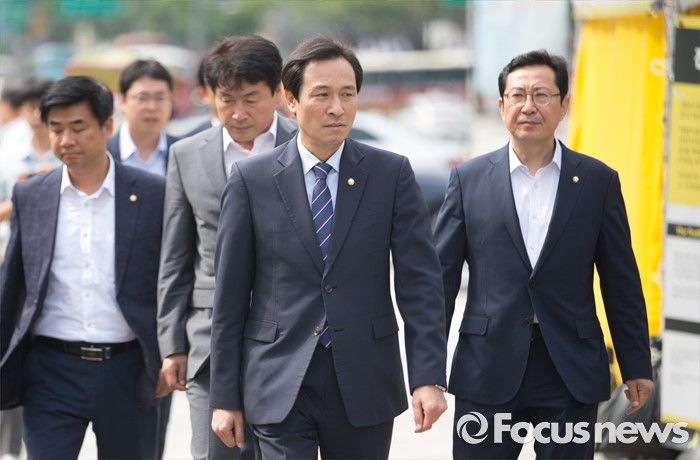 (서울=포커스뉴스) 1일 오전 서울 종로구 광화문 광장에서 우상호(가운데) 더불어민주당 원내대표와 의원들이 이석태 세월호 참사 특별조사위원장의 단식농성장 방문을 위해 이동하고 있다.