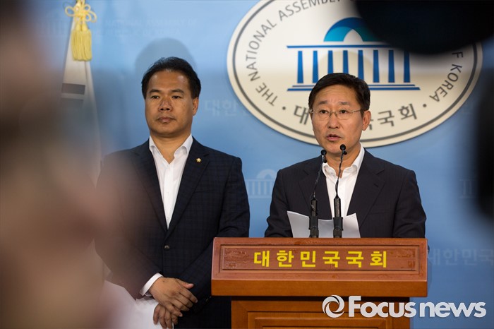 (서울=포커스뉴스) 박범계(오른쪽) 더불어민주당 의원과 이용주 국민의당 의원이 2일 오후 서울 여의도 국회에서 고위공직자 비리수사처 관련 경과 및 향후 일정에 대해 발표 하고 있다.