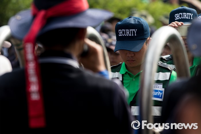 (아산=포커스뉴스) 1일 오후 충남 아산 탕정면 갑을오토텍에서 노조원들과 사측 경비 용역들이 대치하고 있다.
