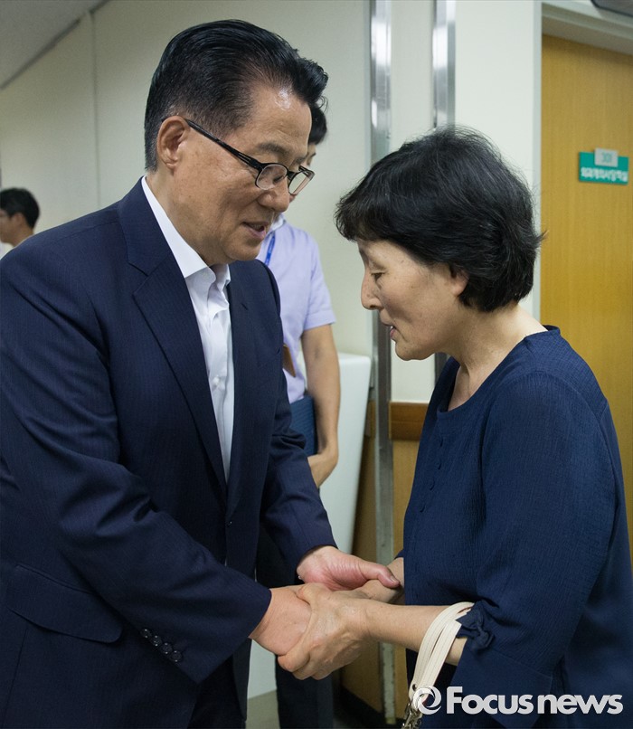 (서울=포커스뉴스) 박지원(왼쪽) 국민의당 비상대책위원장이 2일 종로구 서울대학교병원을 찾아 지난해 민중총궐기 당시 경찰의 물대포를 맞고 입원 중인 백남기 농민을 위로 방문한 뒤 부인 박경숙 여사를 격려하고 있다.