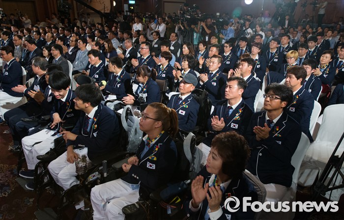 (서울=포커스뉴스) 2일 오후 서울 송파구 올림픽파크텔에서 열린 2016 리우 패럴림픽 대한민국 선수단 결단식에 참석한 선수단이 박수치고 있다.