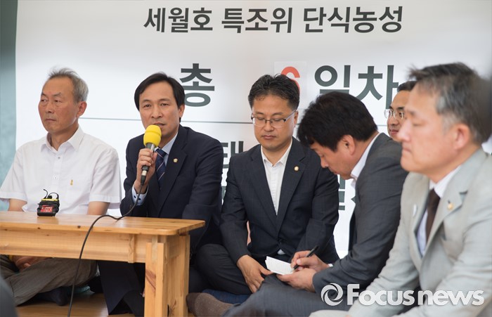 (서울=포커스뉴스) 1일 오전 서울 종로구 광화문 광장에서 이석태 세월호 참사 특별위원장의 단식농성장을 방문한 우상호 더불어민주당 원내대표가 격려 발언을 하고 있다.