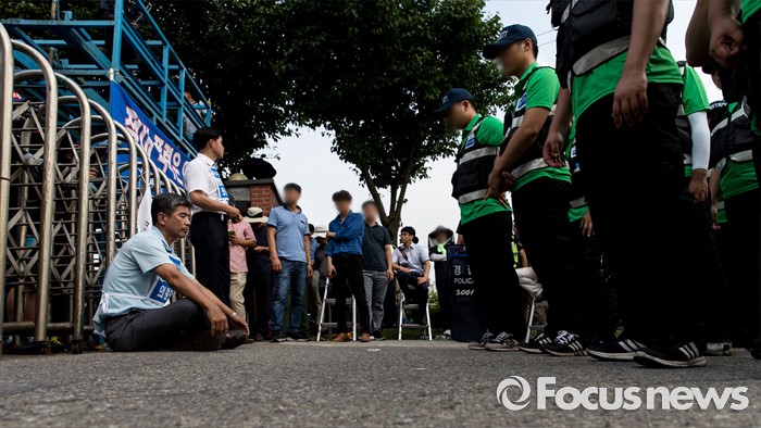 (아산=포커스뉴스) 1일 오후 충남 아산 탕정면 갑을오토텍에서 노조원들과 사측 경비 용역들이 대치하고 있다.