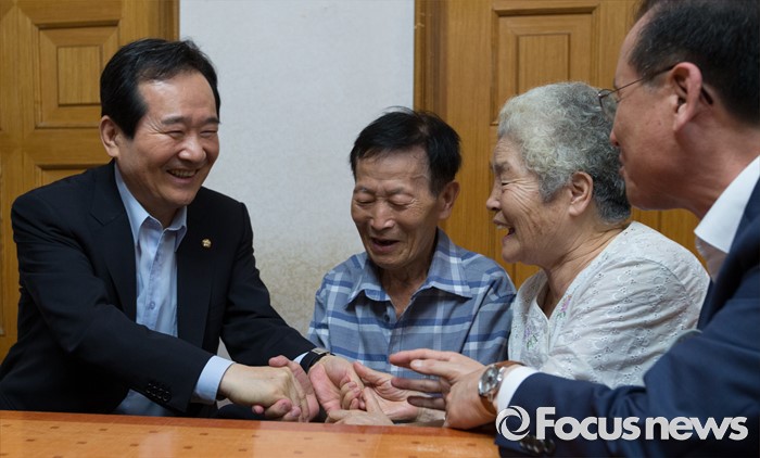 (서울=포커스뉴스) 정세균 국회의장이 2일 오전 서울 종로구 창신동에 거주하고 있는 고령 이산가족 김문각 할아버지(84세, 평안남도 양덕군 청계리) 가정을 방문해 김 할아버지와 인사하고 있다. 오른쪽은 아내 이오례 할머니.
