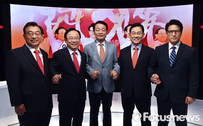 (서울=포커스뉴스) 2일 오후 서울 상암동 MBC 스튜디오에서 열린 '새누리당 대표 경선 TV토론회'에 참석한 의원들이 포즈를 취하고 있다. 왼쪽부터 이정현, 이주영, 한선교, 주호영, 정병국 의원.
