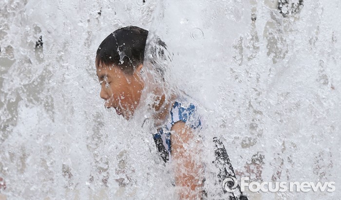 (청주=포커스뉴스) 전국 대부분 지역에 폭염특보가 내려진 1일 오후 충북 청주 오송호수공원 분수대에서 어린이들이 더위를 식히고 있다.