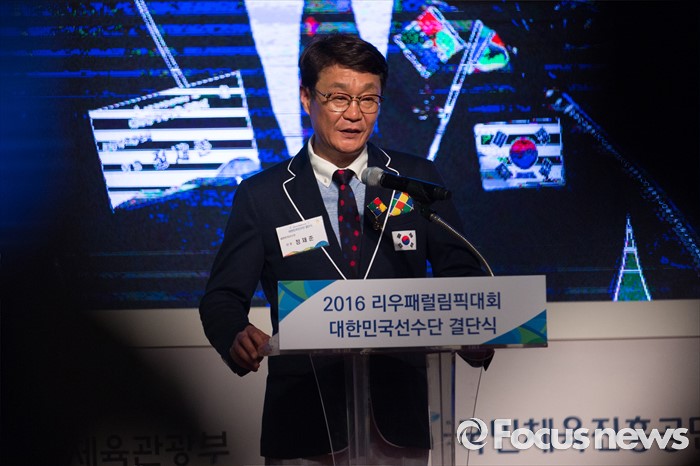 (서울=포커스뉴스) 2일 오후 서울 송파구 올림픽파크텔에서 열린 2016 리우 패럴림픽 대한민국 선수단 결단식에 참석한 정재준 선수단장이 답사하고 있다.