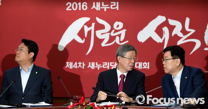 (서울=포커스뉴스) 김희옥(가운데) 새누리당 혁신비상대책위원장과 김광림(오른쪽) 정책위의장이 1일 오전 서울 여의도 새누리당사에서 열린 혁신비상대책위원회의에 참석해 대화 하고 있다.