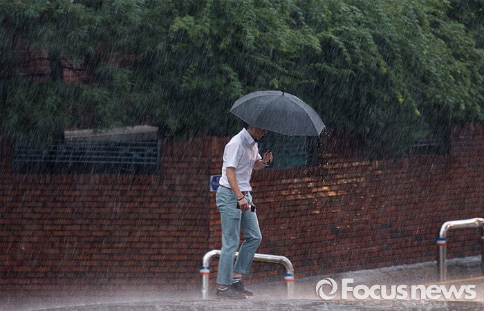 (서울=포커스뉴스) 천둥, 번개를 동반한 강한 비가 내린 2일 오후 서울 서초구 교대역 주변에서 시민들이 비를 피해 발걸음을 재촉하고 있다.