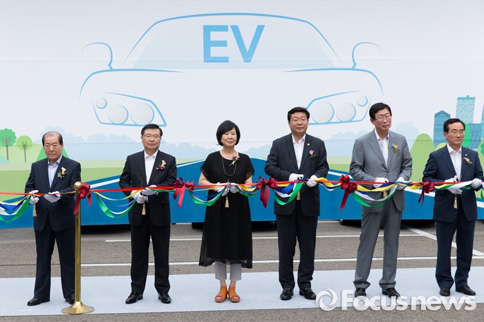 (서울=포커스뉴스) 2일 오후 서울 마포구 상암월드컵경기장에서 개방형 전기차 충전소 1호 착공식에 참석한 주형환(오른쪽 세번째) 산업통상부 장관과 내빈들이 테이프커팅을 하고 있다. 왼쪽두번째부터 조환익 한국전력공사 사장, 주 장관, 손혜원 더불어민주당 의원.