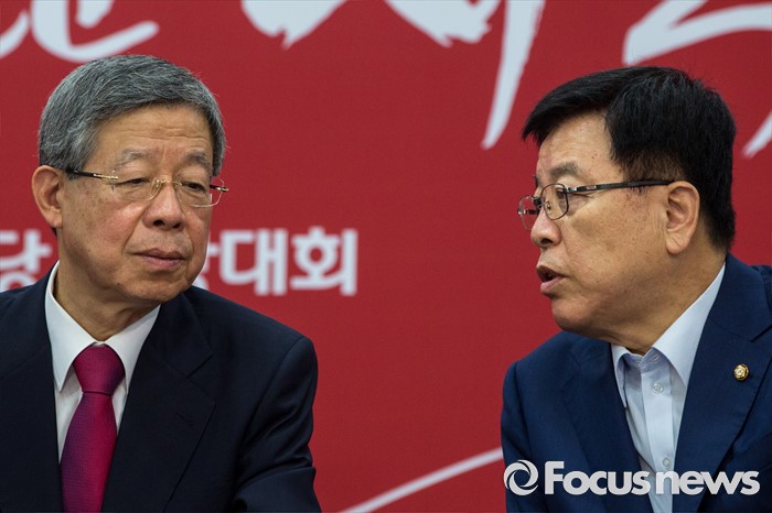 (서울=포커스뉴스) 김희옥(왼쪽) 새누리당 혁신비상대책위원장과 김광림 정책위의장이 1일 오전 서울 여의도 새누리당사에서 열린 혁신비상대책위원회의에 참석해 대화 하고 있다.