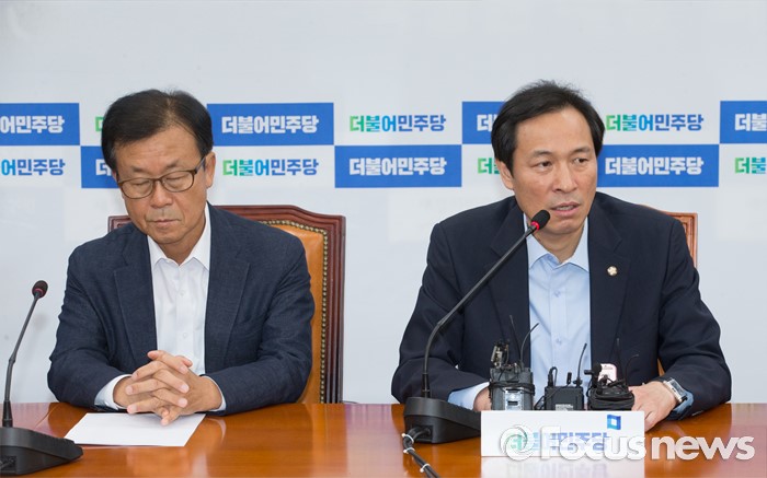 (서울=포커스뉴스) 4일 오전 서울 여의도 국회에서 열린 더불어민주당 사드대책위원회의에 참석한 우상호 원내대표가 모두발언을 하고 있다. 왼쪽은 원혜영 의원.