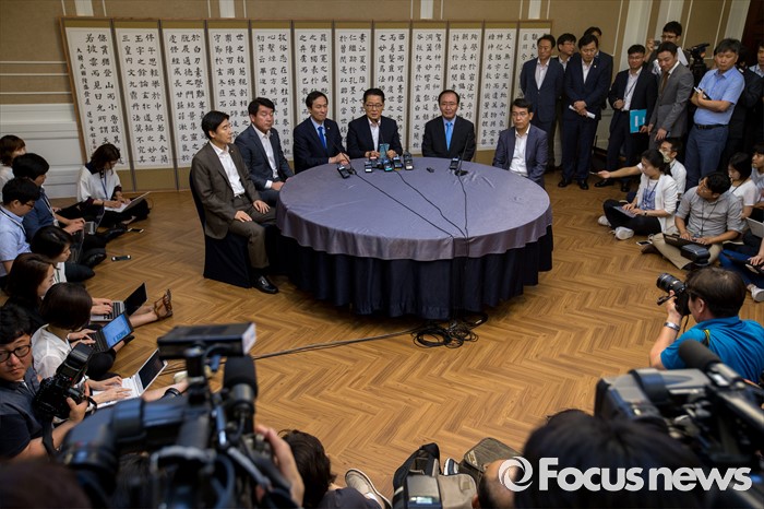 (서울=포커스뉴스) 야3당 원내대표가 3일 오전 서울 여의도 국회에서 열린 원내대표 회동에 참석해 모두발언 하고 있다. 왼쪽 세 번째부터 우상호 더불어민주당 원내대표, 박지원 국민의당 원내대표, 노회찬 정의당 원내대표.