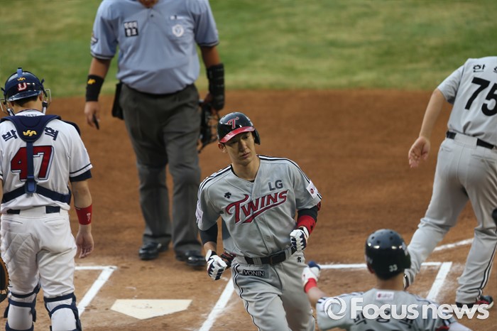 (서울=포커스뉴스) 2일 오후 서울 잠실구장에서 열린 2016 프로야구 LG-두산 경기 1회초 무사, 손주인이 솔로 홈런을 치고 홈 베이스로 들어오고 있다.