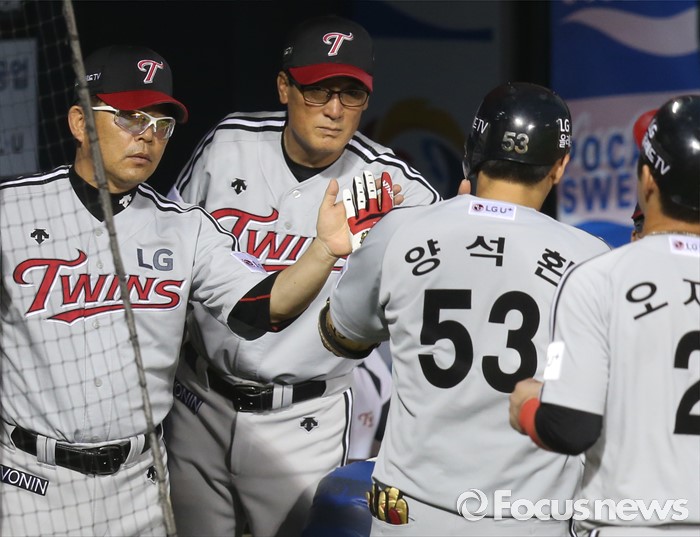 (서울=포커스뉴스) 3일 서울 잠실구장에서 열린 2016 프로야구 LG-두산 경기 4회초 무사 3루에서 LG 양상문 감독이 2점 홈런을 친 양석환과 손을 마주치고 있다.
