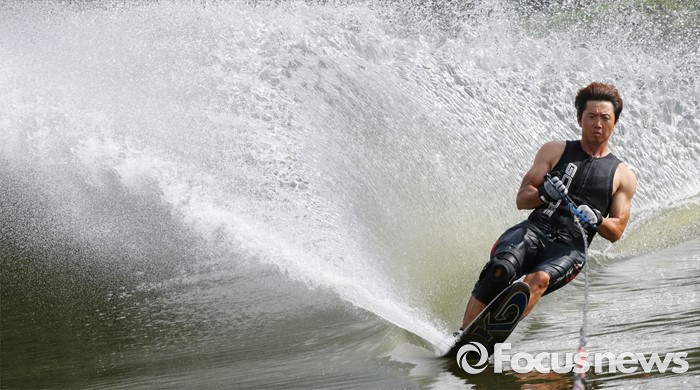 (공주=포커스뉴스) 3일 오후 충남 공주시 금강변에서 수상스포츠전문가들이 스상스키를 타며 물살을 가르고 있다.