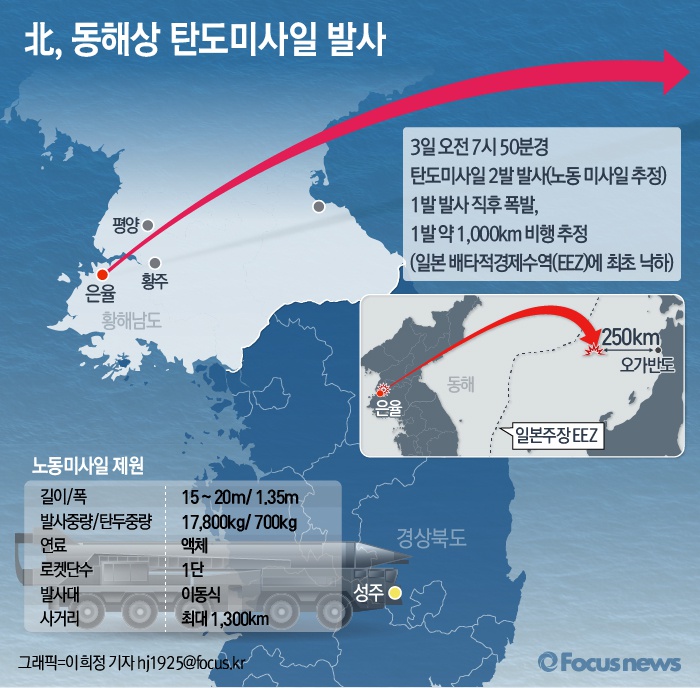 앞서 북한은 3일 오전 7시50분쯤 황해남도 은율군 일대에서 동해상으로 노동미사일로 추정되는 탄도미사일 2발을 발사했다. 1발은 폭발한 것으로 알려졌다.(서울=포커스뉴스) 북한이 3일 오전 7시50분쯤 황해남도 은율 일대에서 동해로 노동미사일로 추정되는 탄도미사일 2발을 발사했다. 2발 중 1발은 발사 직후 폭발했으며 1발은 약 1000km가량 비행해 일본 아키타(秋田)현 오가(男鹿)반도 서쪽 250㎞ 지점의 배타적 경제수역(EEZ)에 낙하한 것으로 분석됐다. 북한 탄도미사일이 일본의 EEZ에 낙하한 것은 이번이 처음이다.2016.08.03 이희정 기자