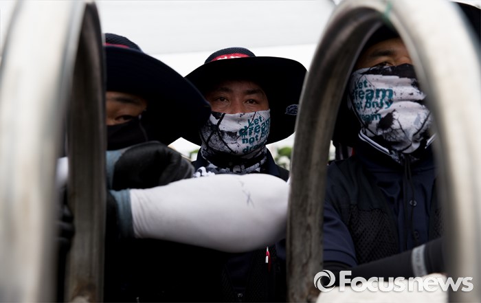 (아산=포커스뉴스) 1일 오후 충남 아산 탕정면 갑을오토텍에서 노조원들과 사측 경비 용역들이 대치하고 있다.