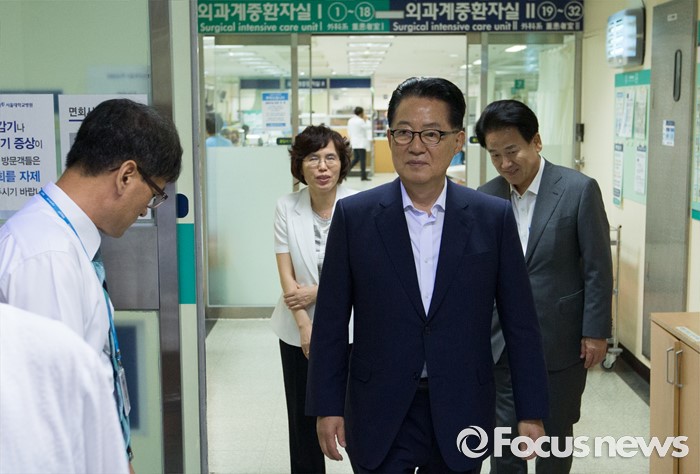 (서울=포커스뉴스) 박지원 국민의당 비상대책위원장과 정동영 의원 등이 2일 종로구 서울대학교병원을 찾아 지난해 민중총궐기 당시 경찰의 물대포를 맞고 입원 중인 백남기 농민을 위로 방문한 뒤 중환자실을 나서고 있다.