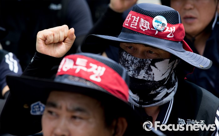 (아산=포커스뉴스) 1일 오후 충남 아산 탕정면 갑을오토텍에서 노조원들이 사측 경비 용역 진입을 반대하며 구호를 외치고 있다.