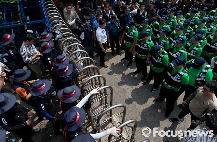 (아산=포커스뉴스) 1일 오후 충남 아산 탕정면 갑을오토텍에서 노조원들과 사측 경비 용역들이 대치하고 있다.