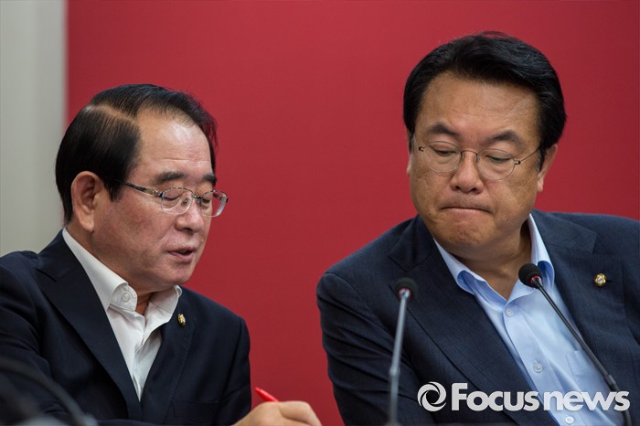 (서울=포커스뉴스) 정진석(오른쪽) 새누리당 원내대표와 박명재 사무총장이 4일 오전 서울 여의도 새누리당사에서 열린 혁신비상대책위원회의에 참석해 대화하고 있다.