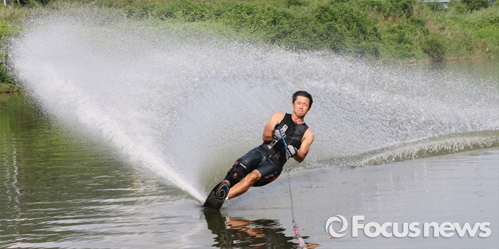 (공주=포커스뉴스) 3일 오후 충남 공주시 금강변에서 수상스포츠전문가들이 스상스키를 타며 물살을 가르고 있다.